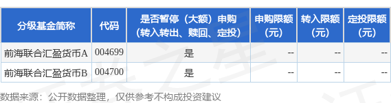 本站消息,9月26日新疆前海联合基金管理有限公司发布《新疆前海联合汇盈货币市场基金暂停非直销渠道大额申购(含转换转入、定期定额投资)业务的公告》。公告中提示,为保证基金的平稳运作,维护现有基金份额持有人利益,自2025年9月29日起新疆前海联合汇盈货币市场基金暂停非直销渠道大额申购(含转换转入、定期定额投资)业务,申购、转换转入上限金额为10.0万元,下属分级基金调整明细如下: