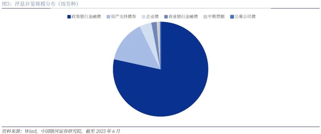 浮息债市场现状。当前我国浮息债市场以挂钩DR007和1年期LPR的政策性金融债为主,合计约3890亿元,占市场总规模的78%。截至2025年6月,我国浮息债市场存量规模为4959亿元,约占债券市场总规模的0.3%左右。而政策性金融债为我国浮息债市场最大品种,合计约3890亿元,占全市场浮息债规模的78%,其参考利率主要以DR007和1年期LPR为主,存量规模分别为1930亿元和1570亿元;其他规模较大的品种为资产支持债券,合计约715亿元,占全市场浮息债规模的14%。